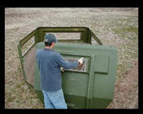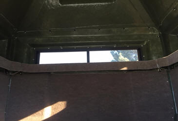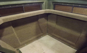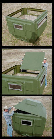 7. Move the carpeted floor section into the partially erected blind and lay it down so that the holes in the floor are over the holes in the foot sections of the wall panels.  NOTE- The floor must go on top of the wall panel feet, not underneath.  This is very important from a safety standpoint.
