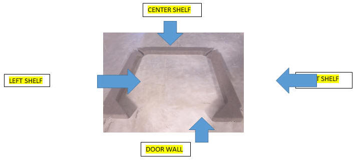 STEP 1- LOCATE THE CENTER SHELF AND ATTACH IT TO THE WALL DIRECTLY ACROSS FROM THE DOOR. HOLD IT IN PLACE DIRECTLY IN FRONT OF THE WINDOW BY INCERTING 2 BOLTS FROM OUTSIDE THE BLIND INTO THE SHELF [LEAVE BOLTS LOOSE UNTILL ALL SHELVES ARE IN PLACE]